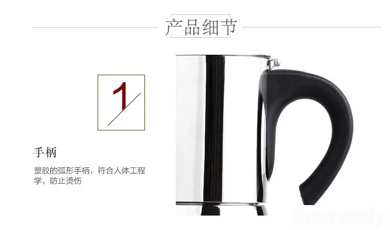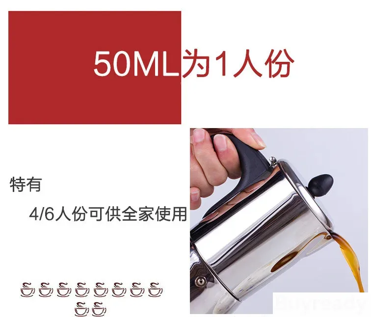 This mocha pot is for 4 people. The capacity of the mocha pot is calculated by 50ml/cup. The ordinary coffee cups brewed by the mocha pot for 4 people are about two cups. Coffee lovers who are not familiar with the mocha pot should pay attention when purchasing!