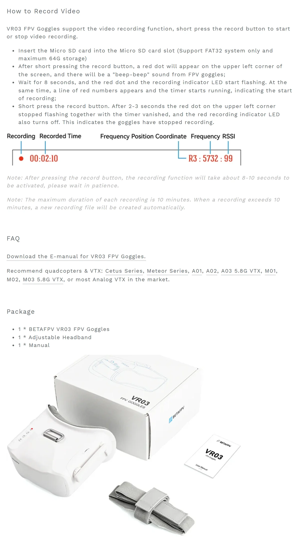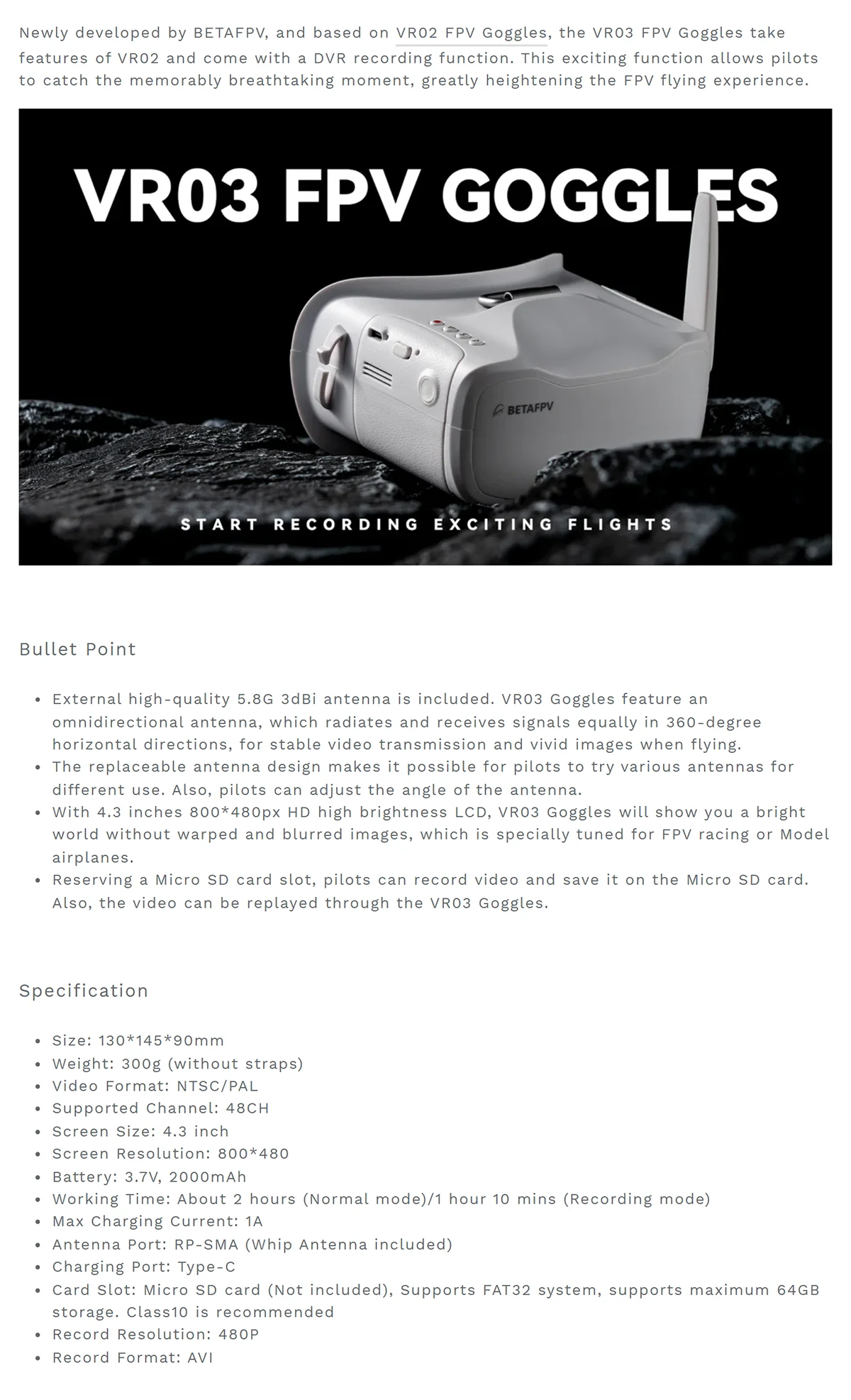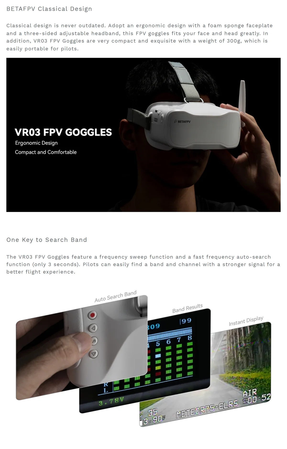 Newly developed by BETAFPV, and based on VR02 FPV Goggles, the VR03 FPV Goggles take features of VR02 and come with a DVR recording function. This exciting function allows pilots to catch the memorably breathtaking moment, greatly heightening the FPV flying experience.