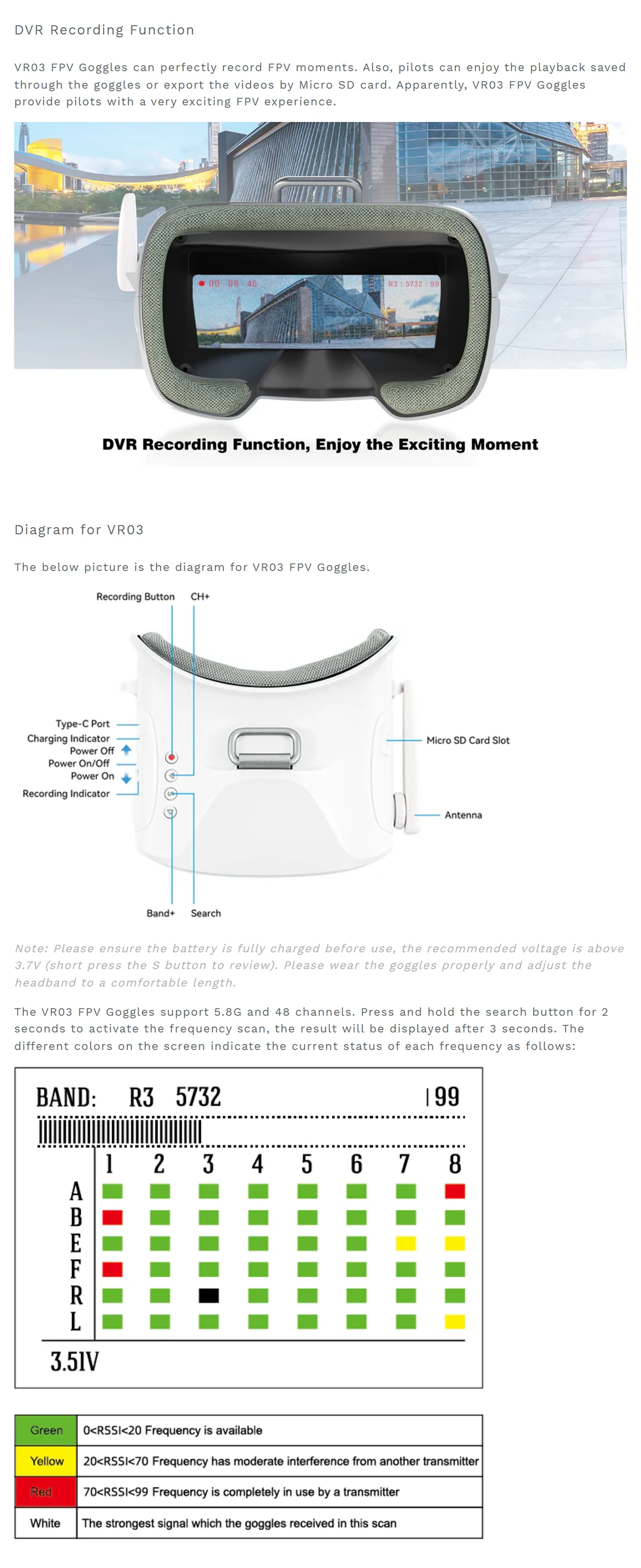 VR03 FPV Goggles can perfectly record FPV moments. Also, pilots can enjoy the playback saved through the goggles or export the videos by Micro SD card. Apparently, VR03 FPV Goggles provide pilots with a very exciting FPV experience.