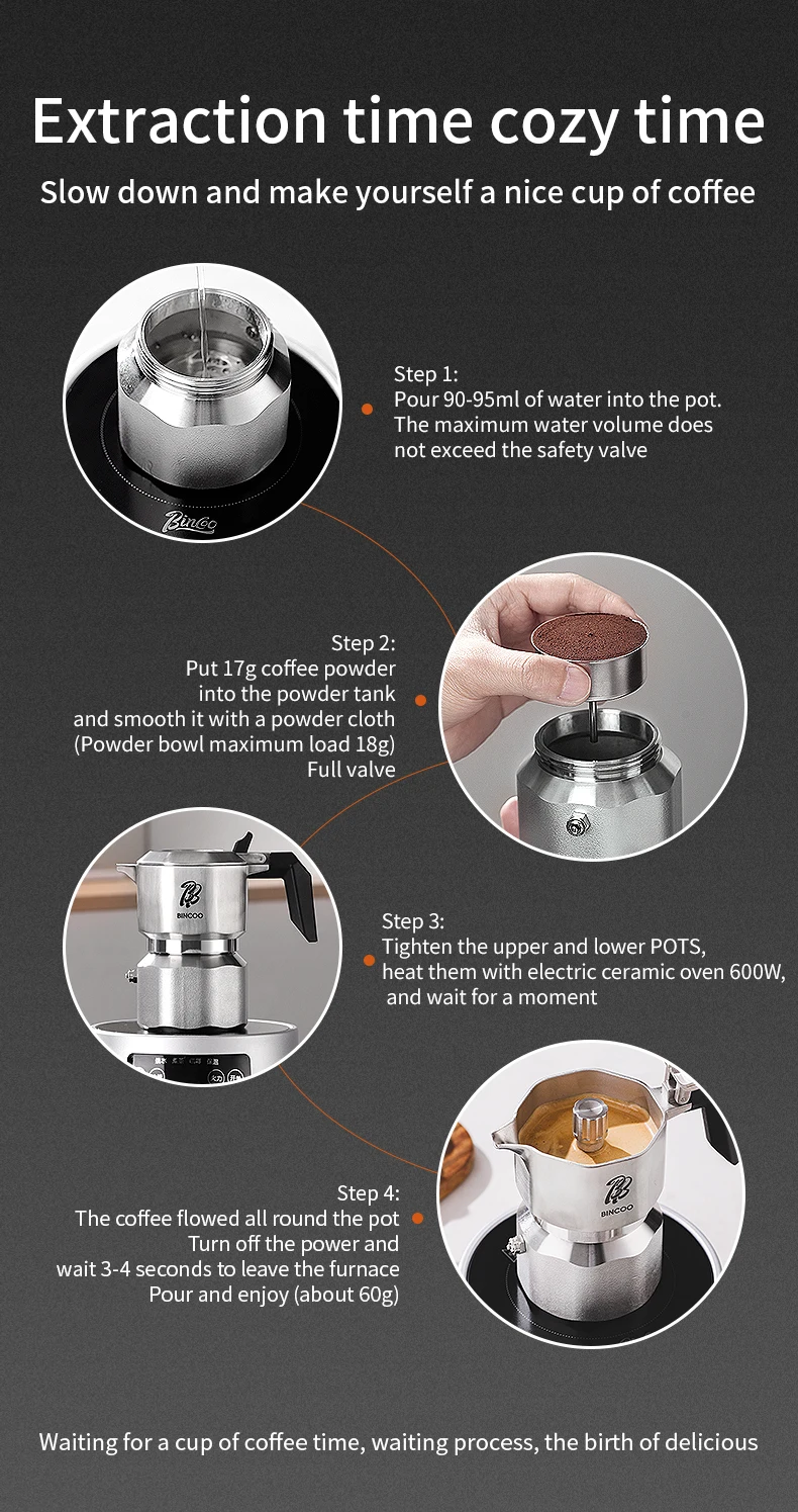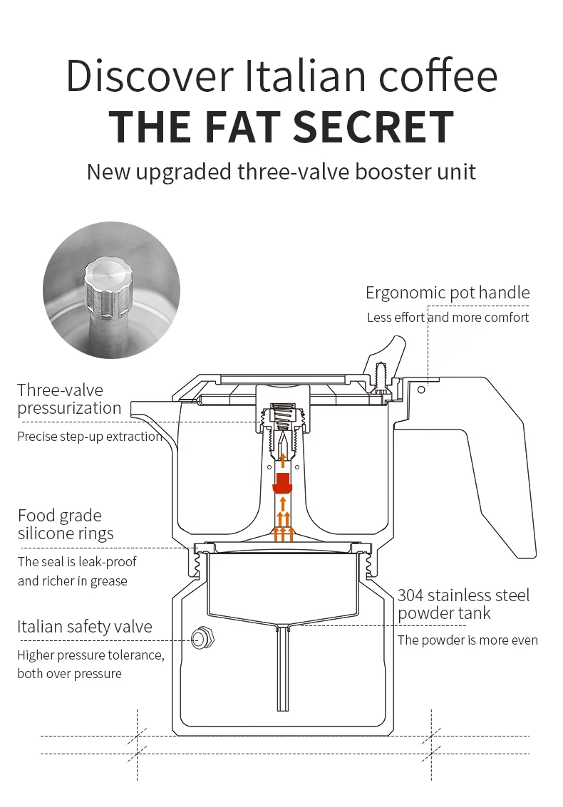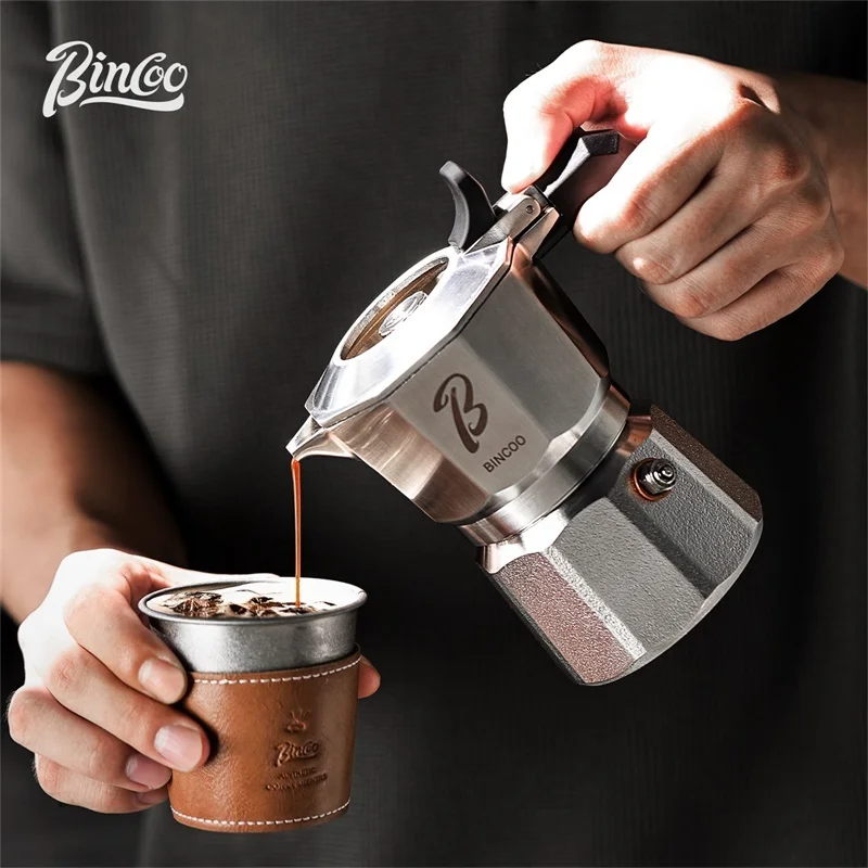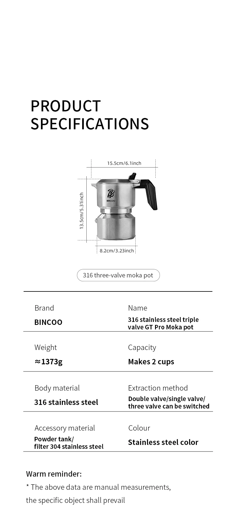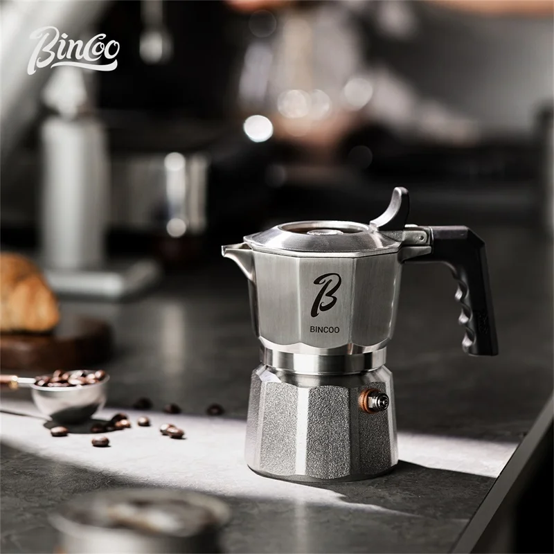 Bincoo 3 valve moka pot is very high quality made with heavy duty stainless steel. It makes very nice coffee. It includes spare valve components for replacement just in case. Its design and quality far exceeds any moka pots in the market. I have 5 moka pots, and this one is the best.