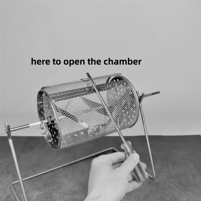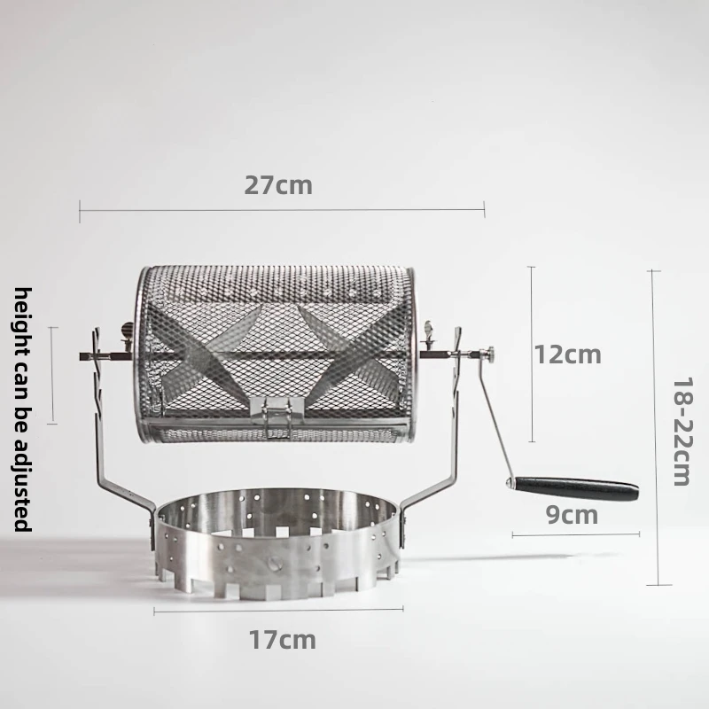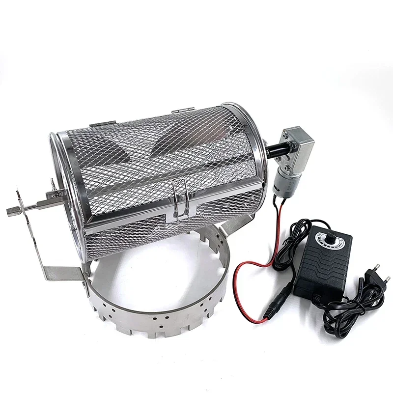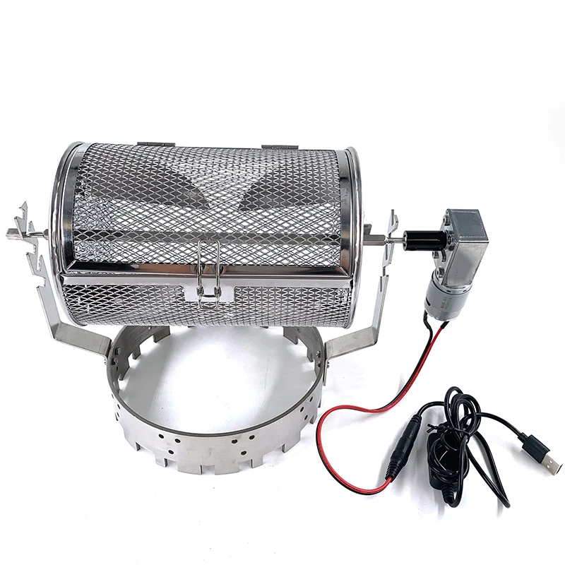 Feature: The rotating speed is fixed, suitable for outdoor use or indoor use both. For outdoor use, you need connect device to a 5V 2A output power bank. For home use, you need connect the device to a phone charger, then plug in with AC power. We will also put a manual handle for the roaster, so it can also manual use.