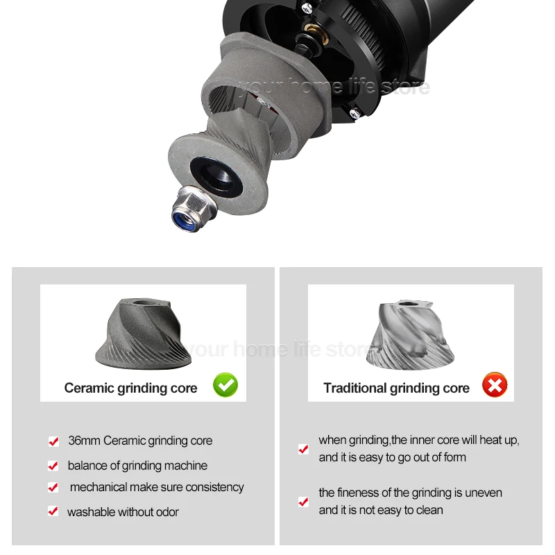 The hopper perfectly feeds coffee beans down into the 36 mm grinder for a consistent grind. The grinder with ceramic burr will never rust or dull or add heat during grinding to damage the original flavor of coffee. It is easy to clean and maintain, just unscrew the bolt on the bottom of the grinder and rinse under warm water.