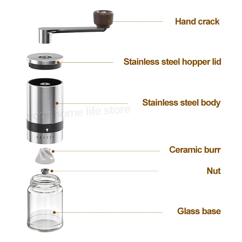 manual coffee bean grinder comes with 6 precise settings so that you can set a specific grind for your favorite style of brew. Delivering grind levels better than electric coffee grinder machines and less noise. Relaxing and enjoy your coffee time with coffee grinder.