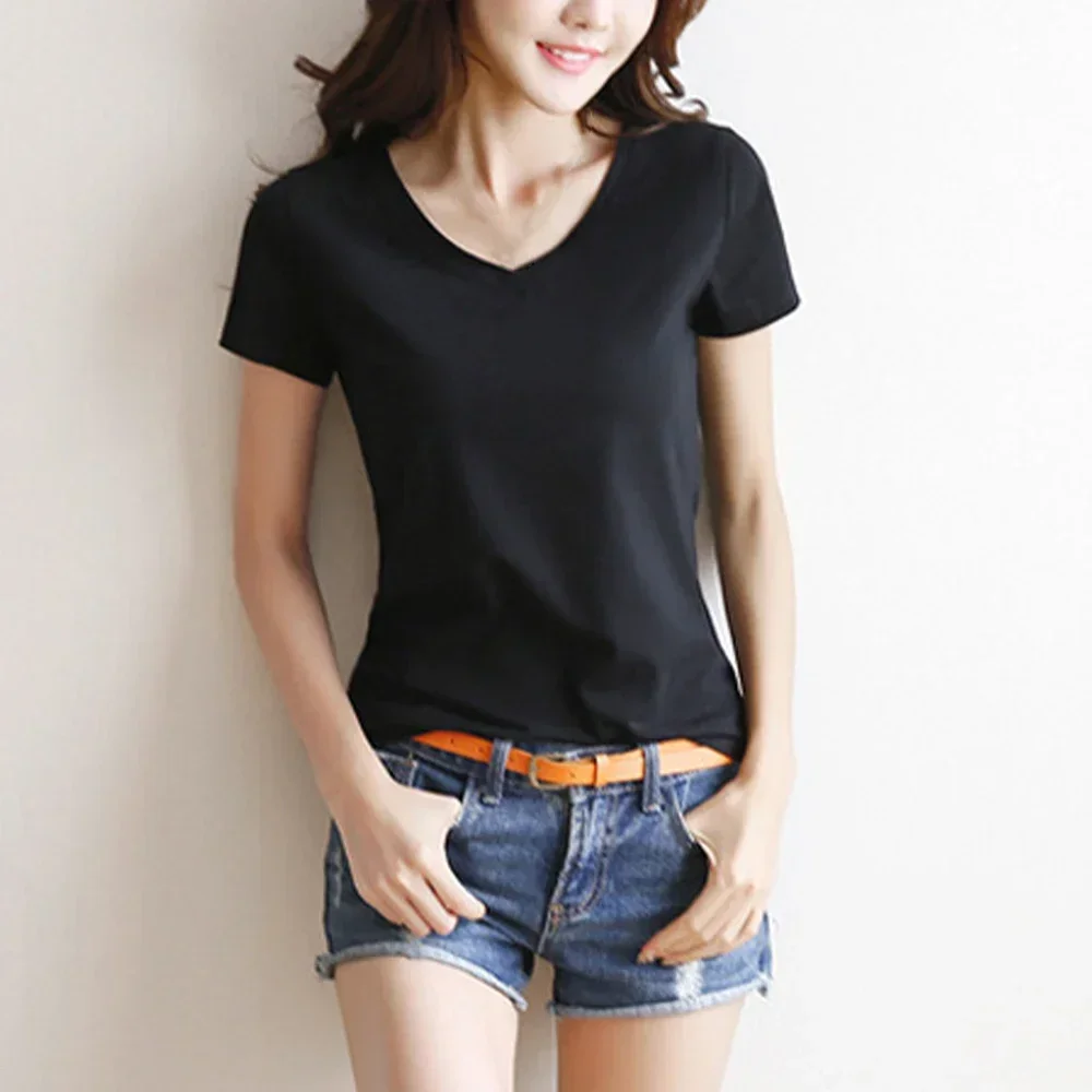 Womens Basic Tees Shirt Solid Plain Top Short Sleeve Roundneck V Neck Top