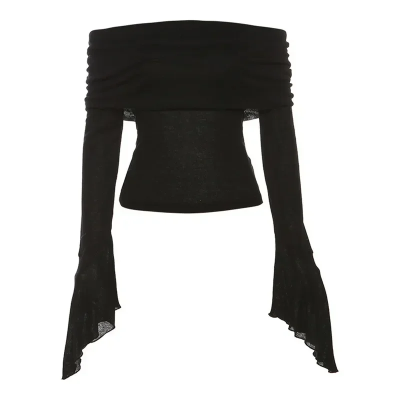 Y2k Aesthetic Simple Fashion Women’s Tee Shirts Slash Neck Long Sleeve Solid Casual T-Shirts Vintage Off Shoulder Trendy Tshirts